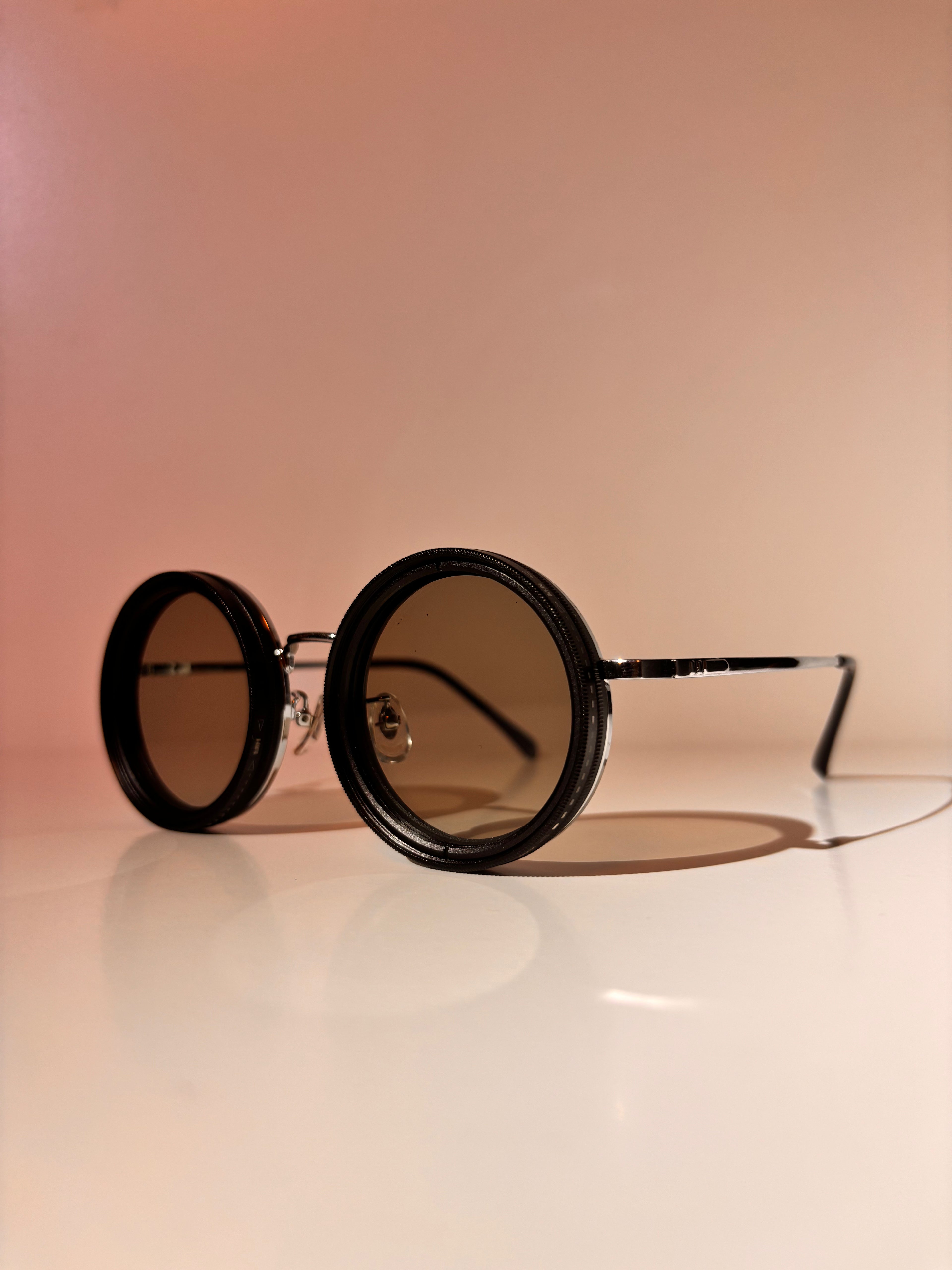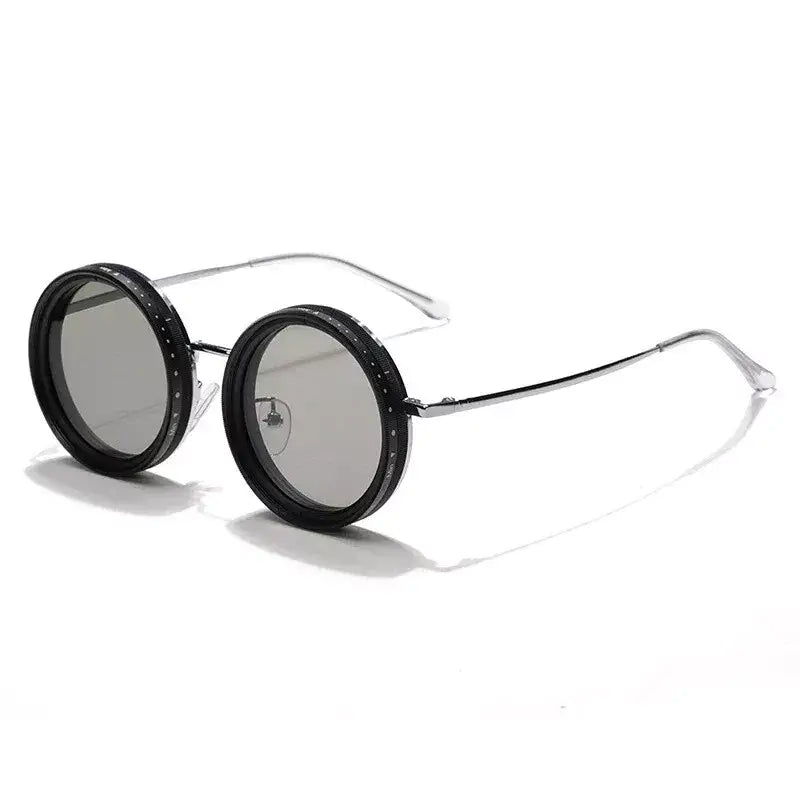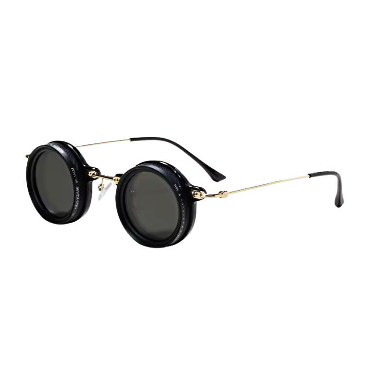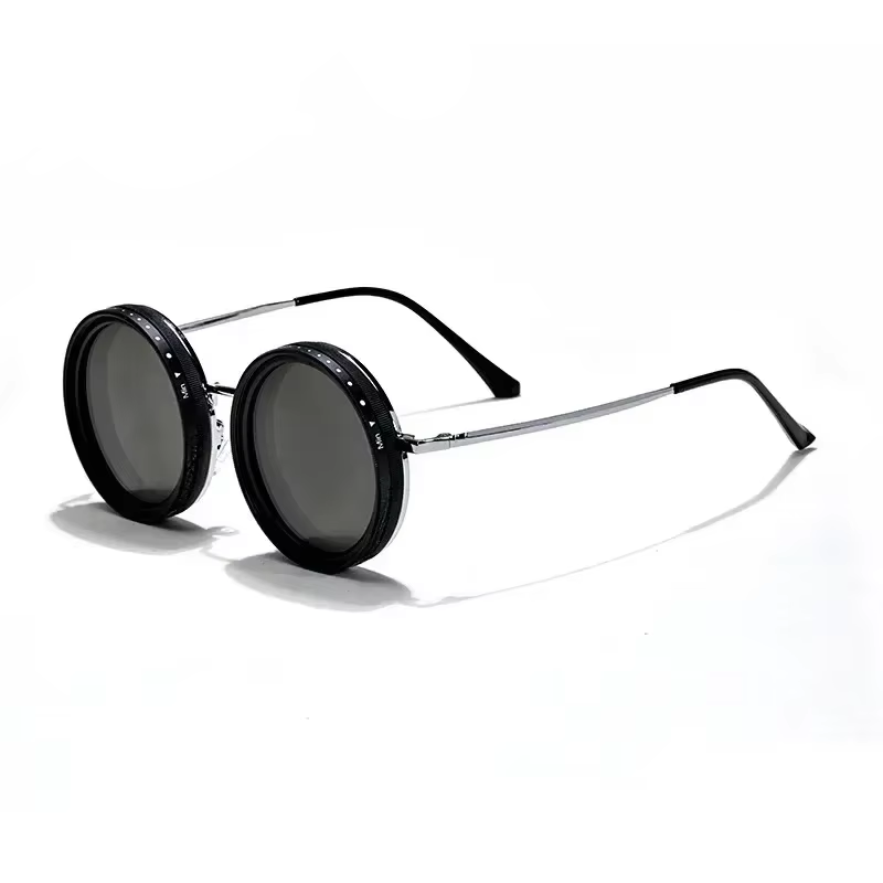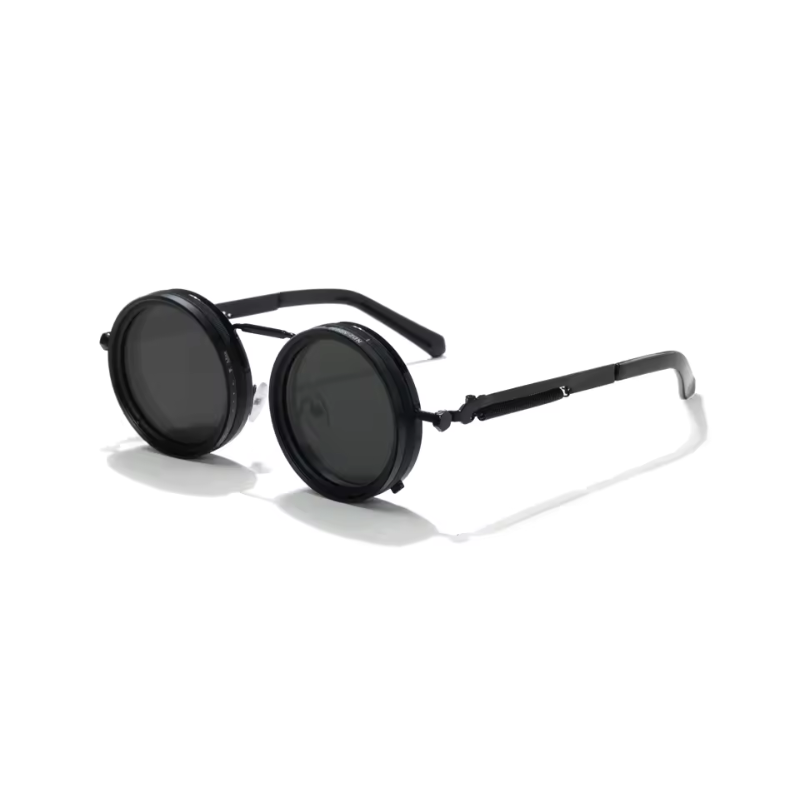 Varje par är noggrant handtillverkat med förstklassiga material. De djupsvarta linserna omsluts av precist utformade metallbågar, där varje detalj är finslipade till perfektion. Den unika vridmekanismen ger dig möjlighet att steglöst justera ljusgenomsläppet efter dina behov - från lätt skuggning till fullt solskydd.